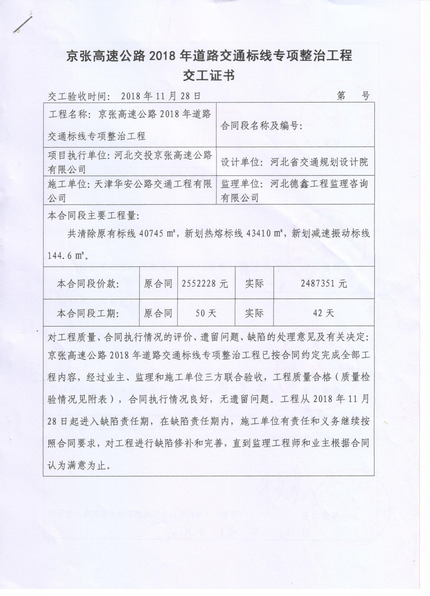 京張高速公路2018年道路交通標(biāo)線(xiàn)專(zhuān)項(xiàng)整治工程交工證書(shū)